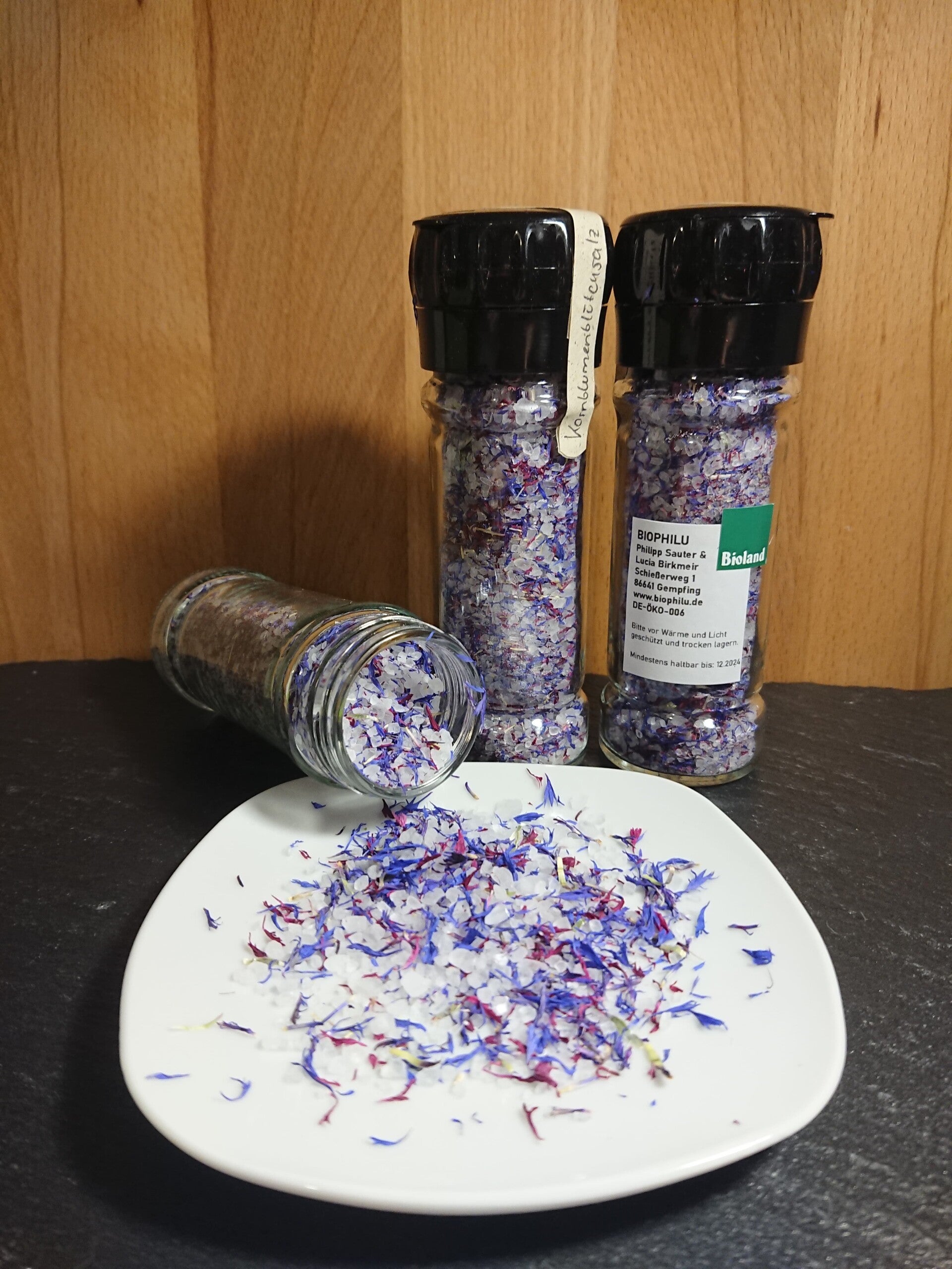 Die Kornblumen in Blau und Rot bauen wir auf unseren Biofeldern an - händisch werden sie gezupft und getrocknet, sodass sie ihre kräftige Farbe behalten.